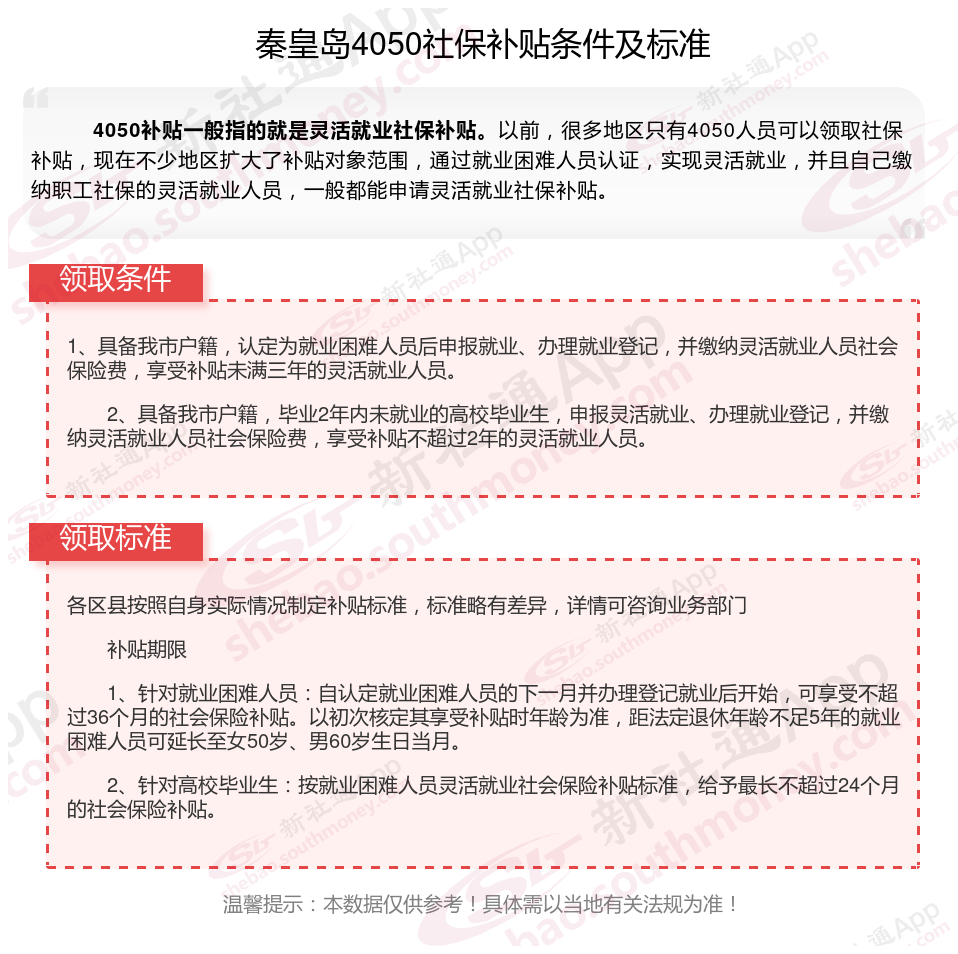 一、2025年秦皇岛4050社保补贴标准及条件是多少?