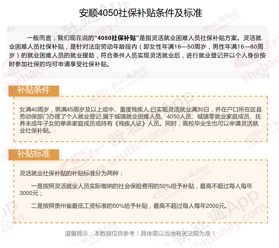 安顺40、50、60 年出生人群补贴需要符合什么条件,4050补贴需要哪些资料?4050补贴适用人群的年龄要求是:女性年满40周岁,男性年满50周岁。