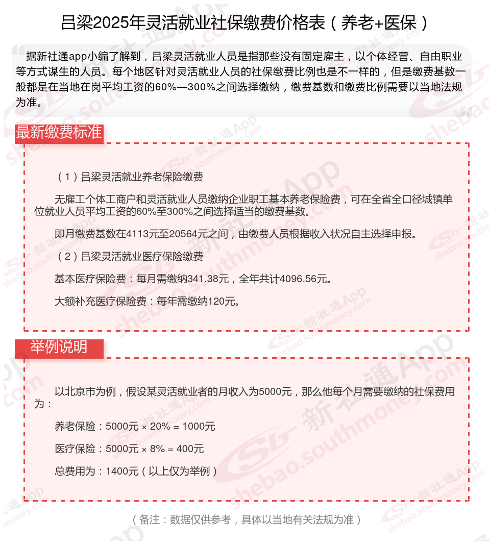 灵活就业社保通常只需缴纳养老和医疗两项(部分地区可自愿选缴失业险),其他险种无需强制缴纳。灵活就业社保缴费满15年后,退休后可领取养老金,避免老年无收入来源。接下来随社保君了解一下2025年吕梁灵活就业人员社保交多少钱,2025年吕梁灵活就业社保缴费标准的详细内容。
