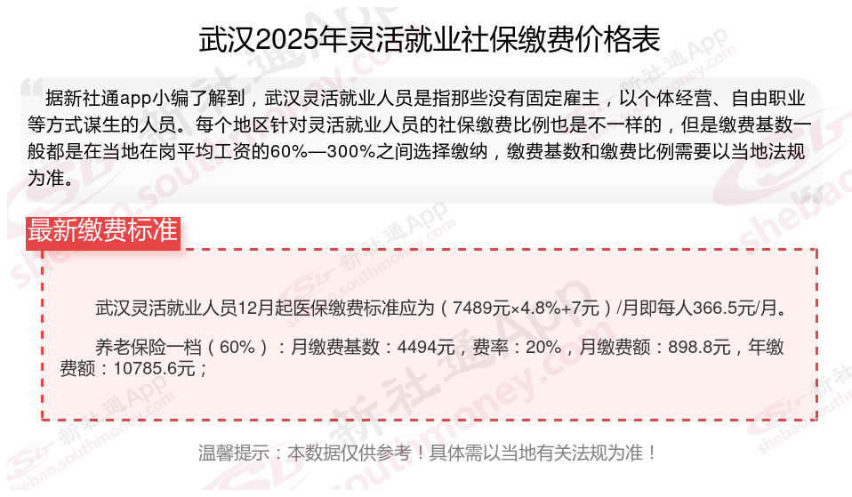 (2)武汉灵活就业社保参照职工社保的缴费基数进行缴纳。灵活就业社保由于各地区经济发展水平不一,职工月平均工资存在差异,所以各地区的社保缴费基数上下限也不同。