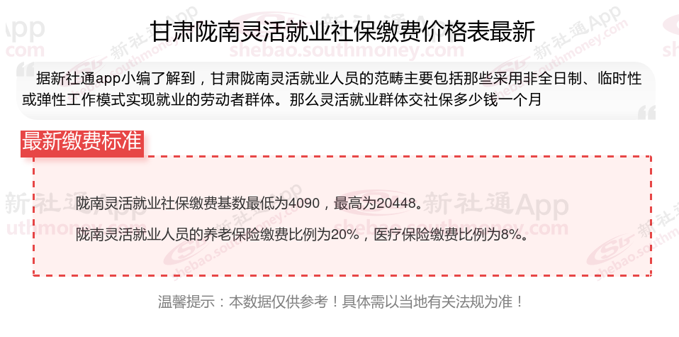 一、2024年甘肃陇南灵活就业社保缴费标准表 甘肃陇南灵活就业社保多少钱一个月?