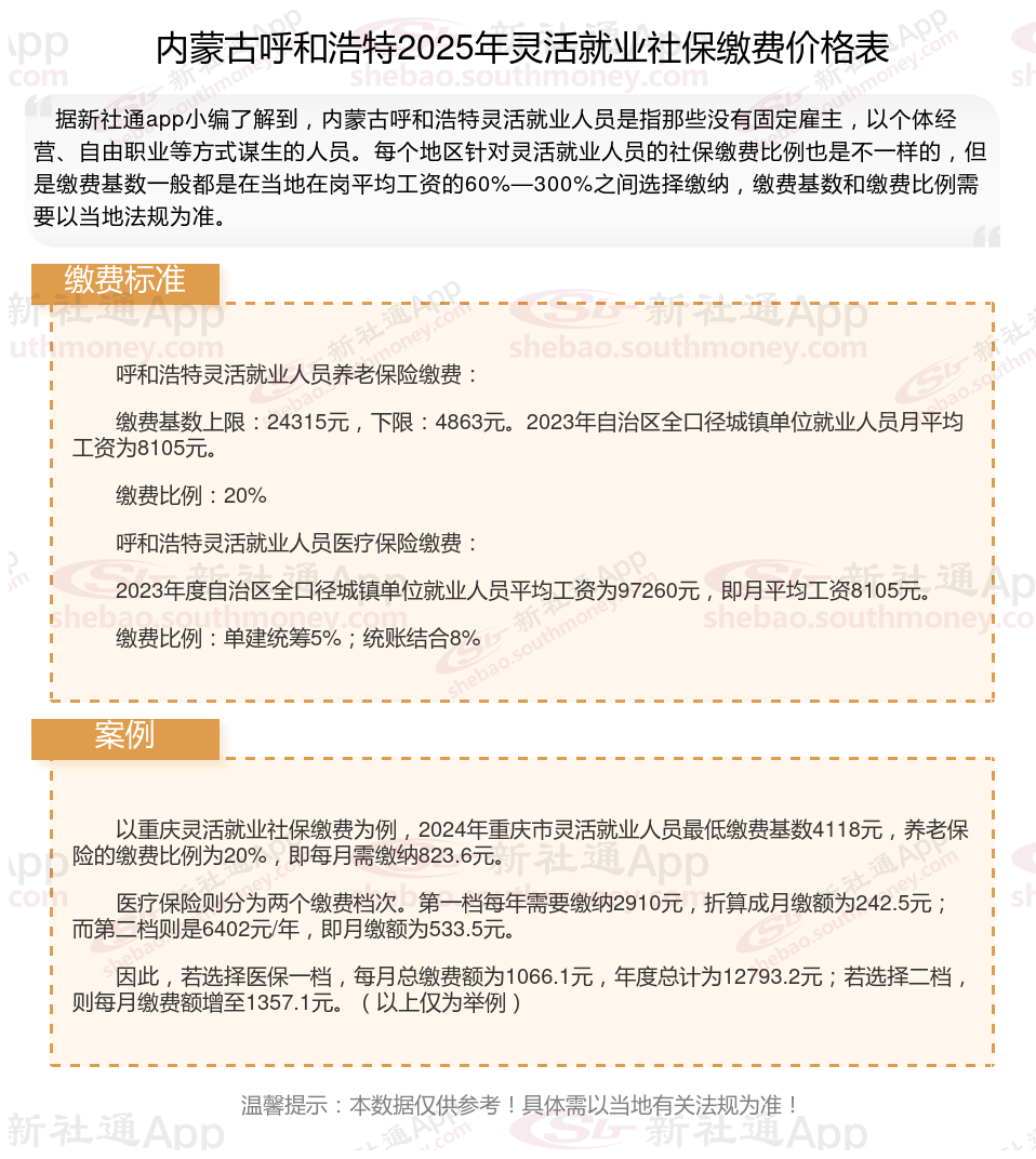 内蒙古呼和浩特灵活就业社保交多少钱?最新内蒙古呼和浩特灵活就业人员社保养老缴费标准明细来了,根据新社通app-社保缴费查询工具提供的2025社保缴费标准详情数据: