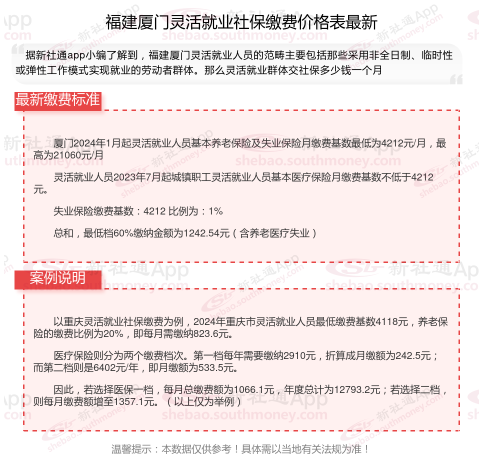 一、福建厦门灵活就业社保缴费标准表2024年 福建厦门灵活就业社保多少钱一个月?