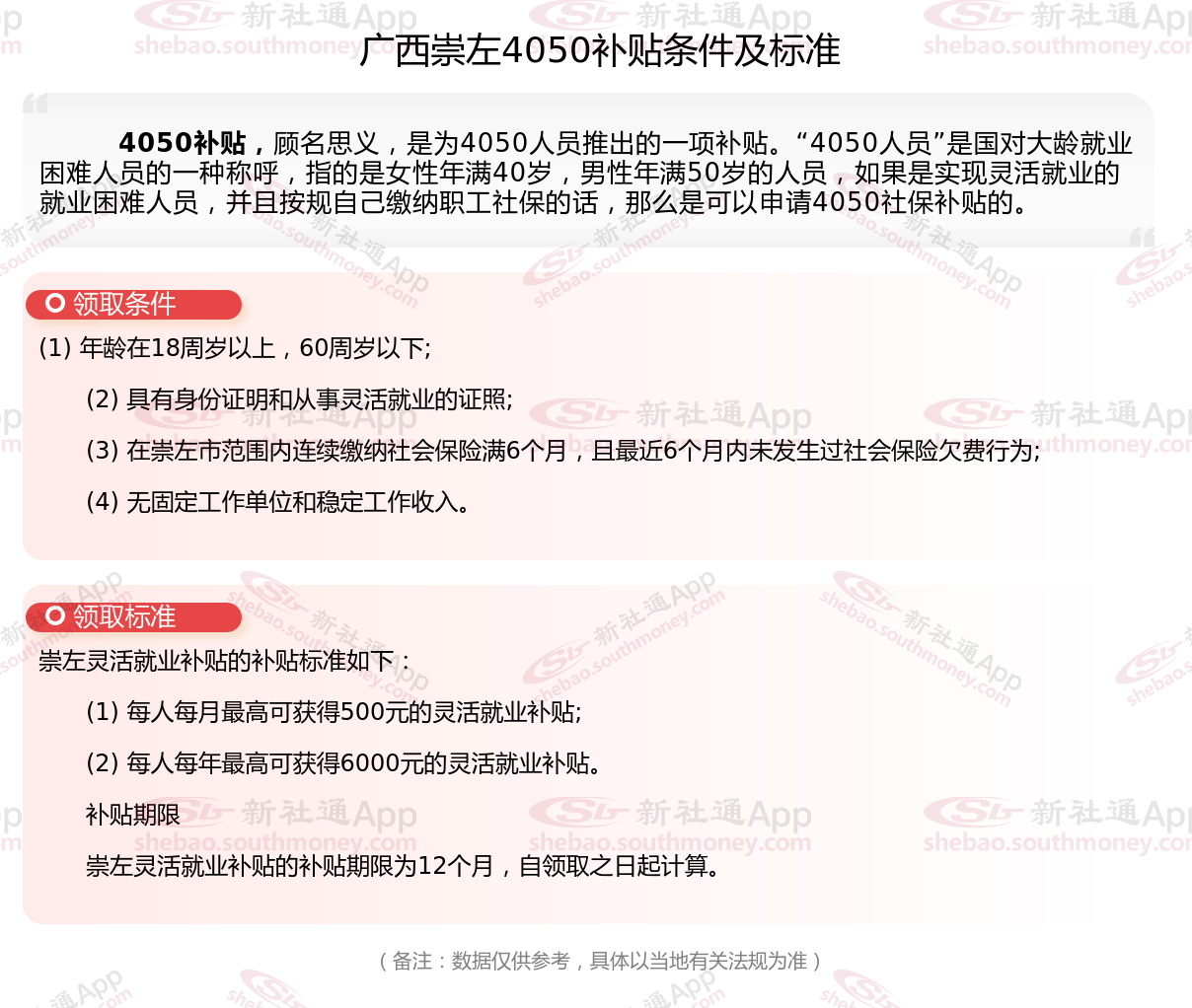 二、2025年广西崇左4050社保补贴标准及条件,最新如下: