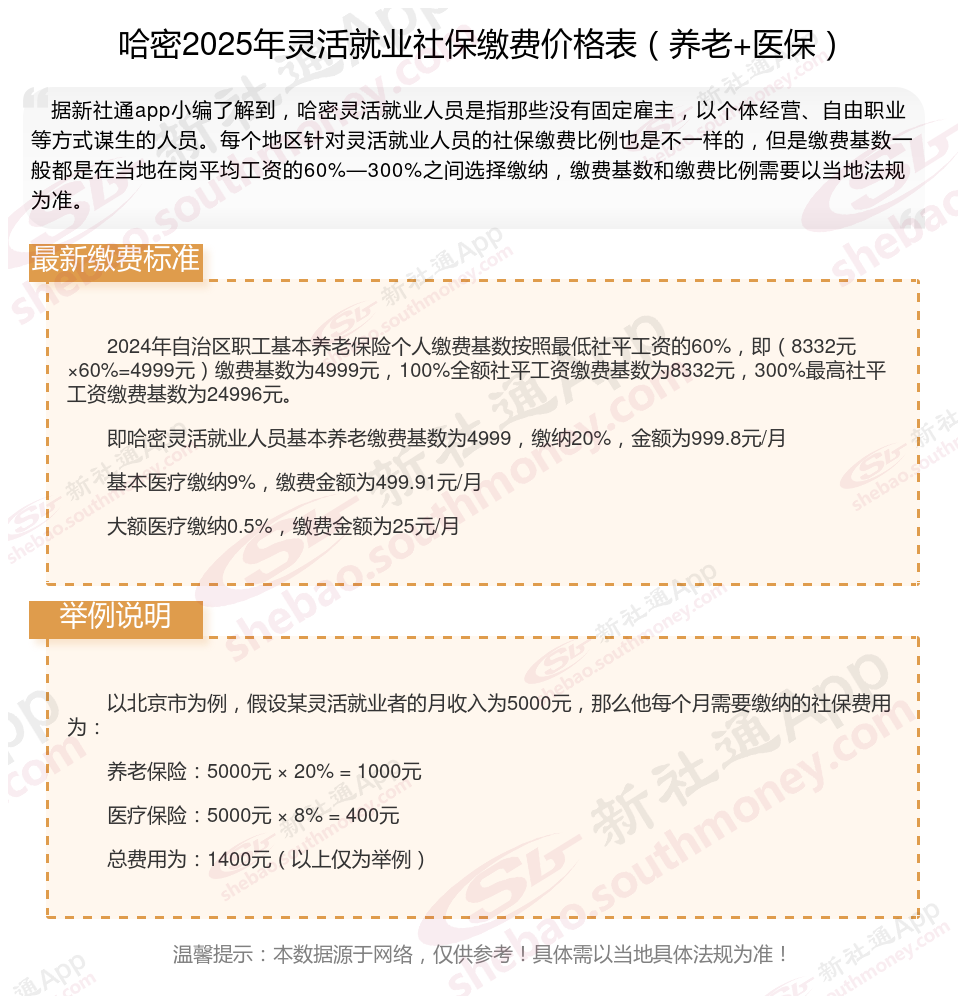 哈密灵活就业人员社保缴费基数2024-2025年最新标准是多少 灵活就业交社保划算吗?下表是2024-2025年哈密社保费用明细参考,根据新社通app-社保缴费查询工具提供的最新数据如下: