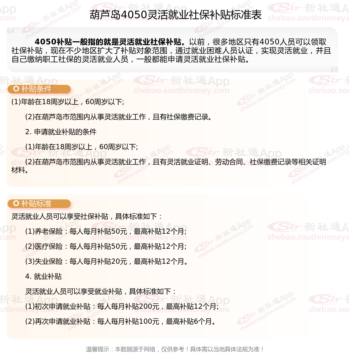 一、2025年葫芦岛灵活就业4050社保补贴标准及条件是什么