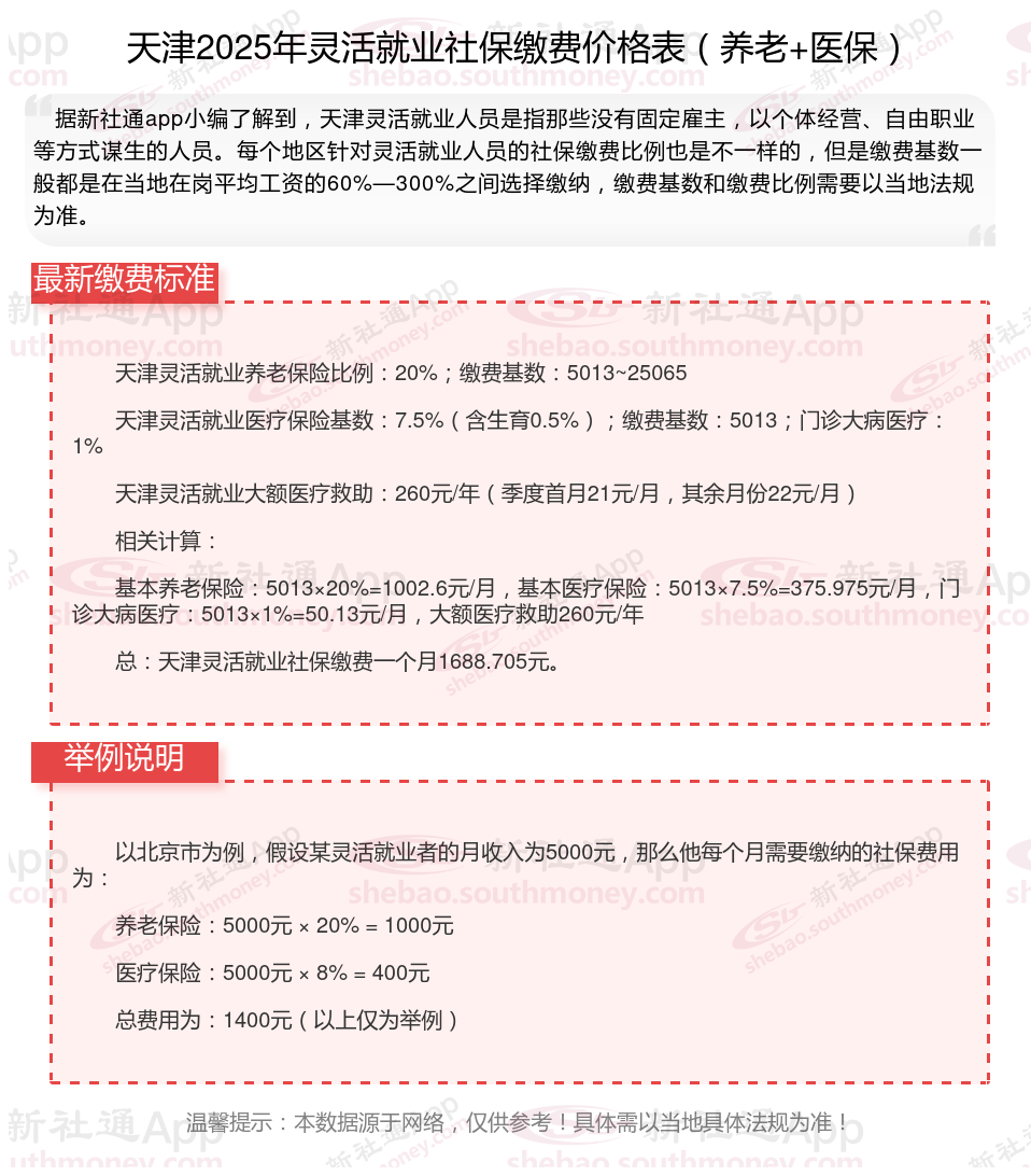 2025年天津灵活就业人员社保需要交多少钱?社保能抵御疾病、失业、养老等重大风险,避免陷入经济困境。也能享受医保报销、养老金增长等红利。社保是劳动者的法定权利,断缴可能影响购房、落户、子女教育等。接下来随新社通APP小编一起来看看天津灵活就业人员社保缴费的内容。