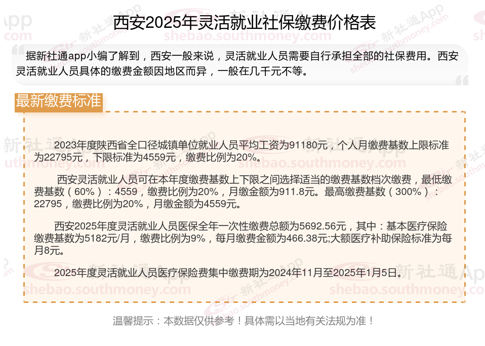 据新社通app数据显示,西安企业灵活就业养老保险的缴费基数为:4559元。
