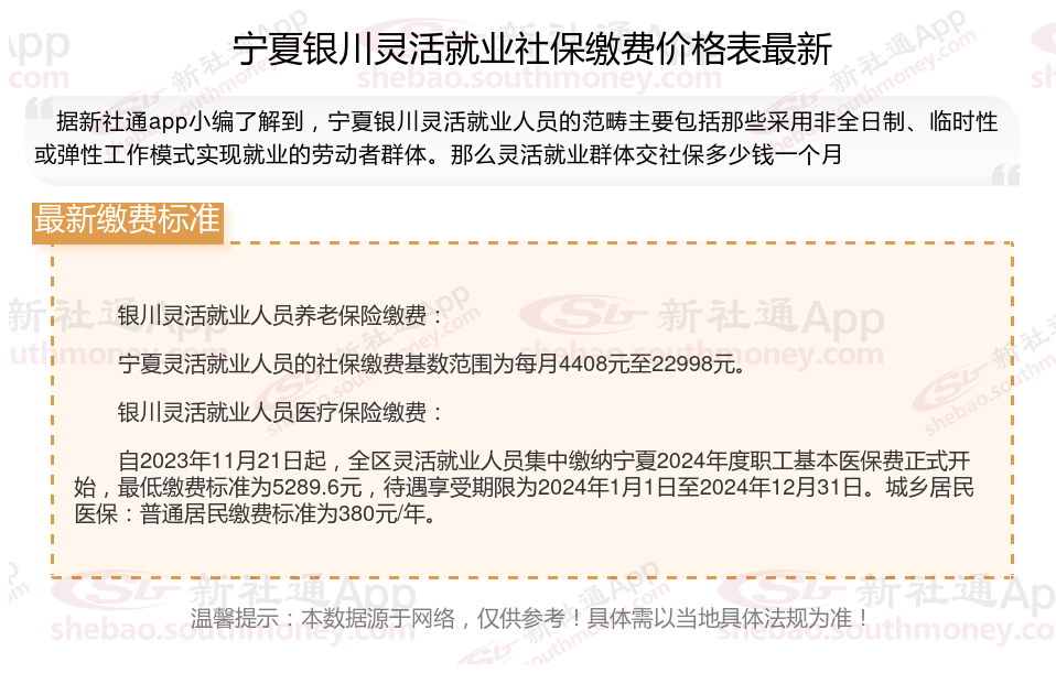 据新社通app数据显示,宁夏银川灵活就业养老保险缴费基数2024-2025年最新标准如下: