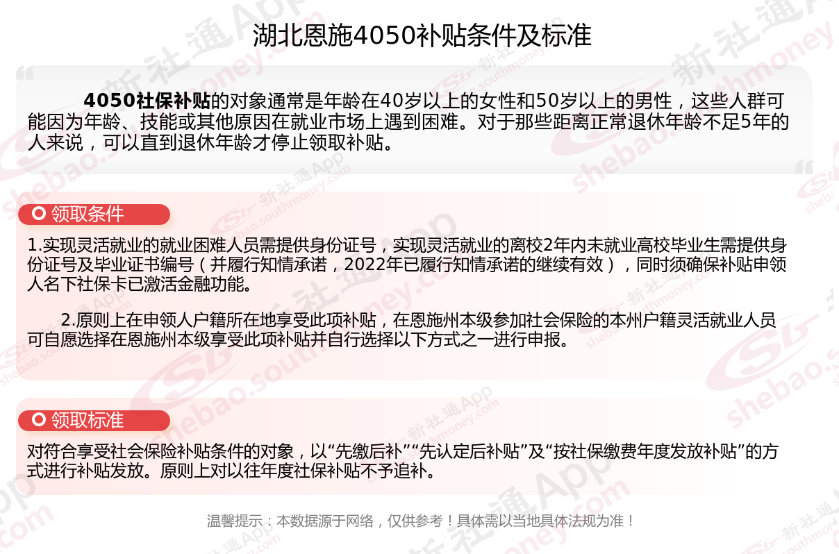 二、2025年湖北恩施4050社保补贴标准及条件,最新如下: