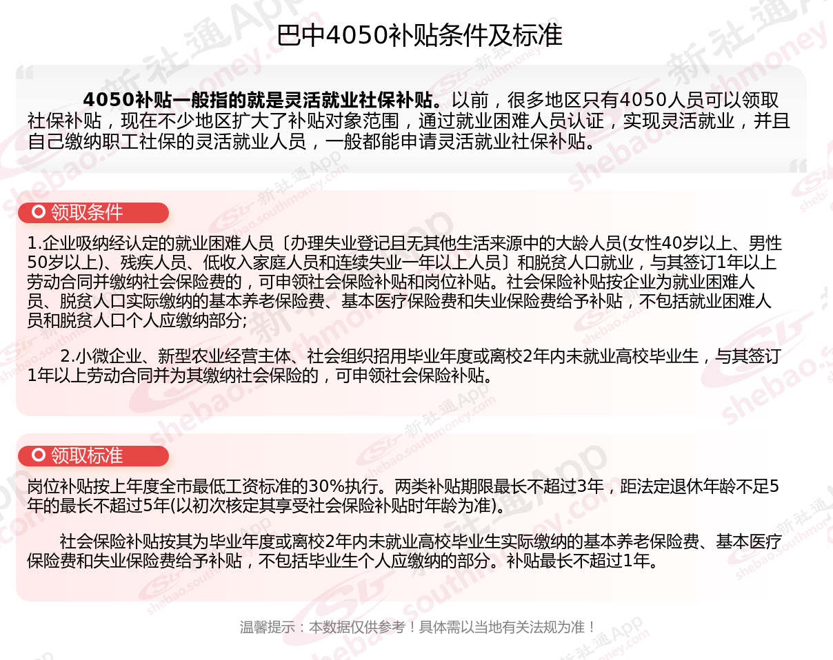 巴中4050灵活就业社保补贴标准如何?“4050补贴”主要是针对大龄就业困难人群的社保补贴,申请条件包括年龄、就业困难、灵活就业并自费缴纳社保,需要持有失业登记证,不同地区可能有细微差别,比如农村户口的限制。那么巴中4050灵活就业社保补贴标准是多少钱?巴中4050社保补贴条件是什么?接下来随新社通APP小编了解一下巴中4050灵活就业社保补贴标准最新资讯。