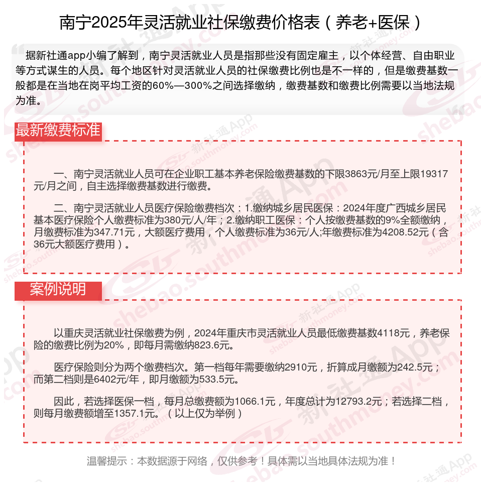 一、2025年南宁灵活就业社保缴费标准表 2025年南宁灵活就业社保多少钱一个月?