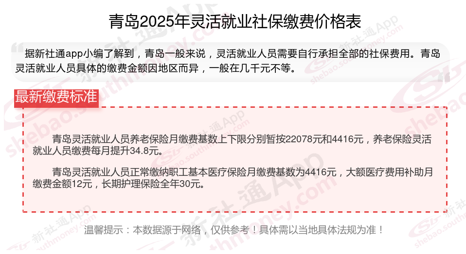 那么,青岛灵活就业人员社保缴费标准2024-2025最新来了,交社保有什么好处?根据新社通app-社保缴费查询工具提供的2025社保缴费标准详情数据: