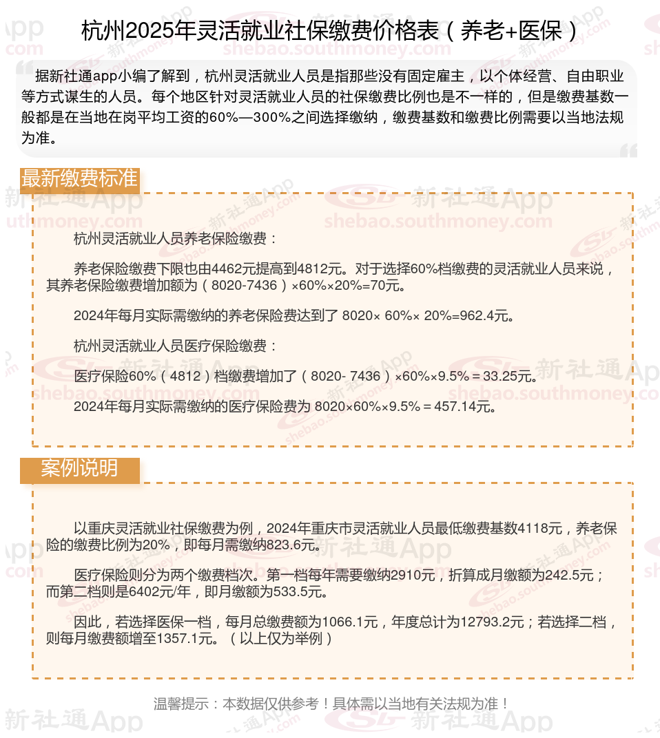 2025年杭州灵活就业人员社保需要交多少钱?灵活就业,作为一种非传统的就业方式,近年来蓬勃发展。为保护这部分人群的权益,国制定了相应的社保缴费法规。2024年,灵活就业社保缴费法规继续完善,涵盖了养老保险、医疗保险、失业保险等多个方面,旨在为灵活就业人员提供全面的社会保证。接下来随新社通APP小编一起来看看。