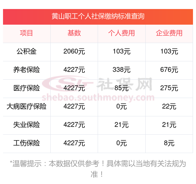 据新社通app显示,黄山社保缴费基数标准2025年,(社保最低一个月要交多少钱)黄山社保费用如下: