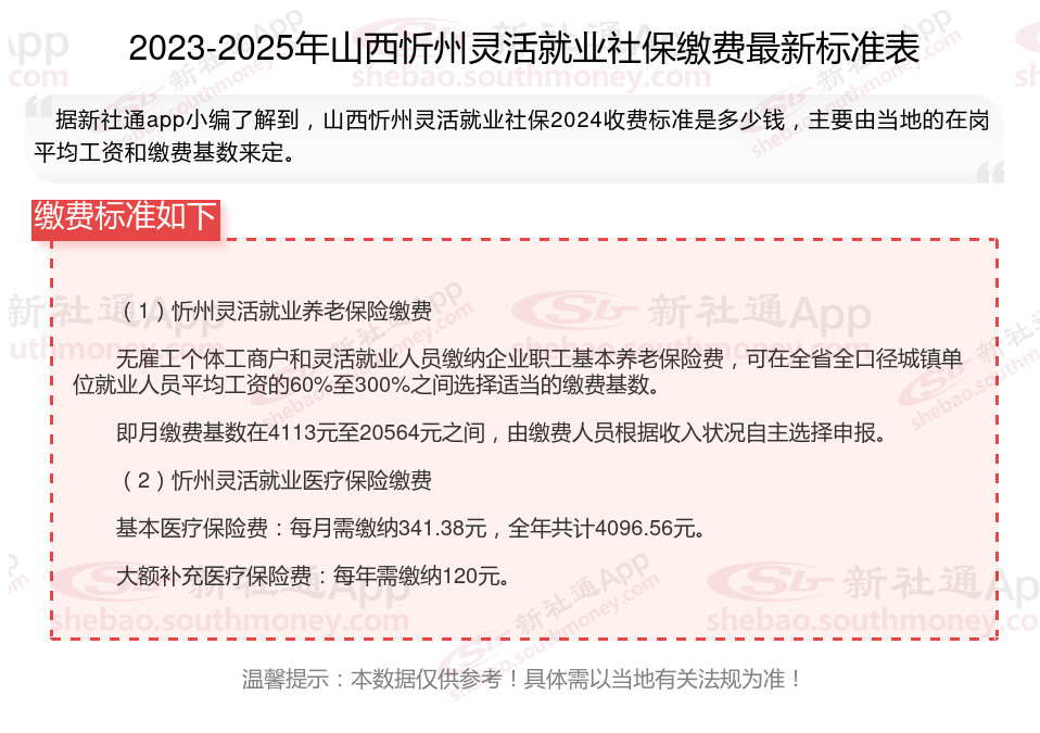 2025灵活就业社保缴费标准的调整,既体现了法规的连续性,又适应了经济社会发展的要求。灵活就业人员应根据自身情况,合理选择缴费基数和缴费比例,确保自身权益得到充分保证。那么2025年山西忻州灵活就业人员社保需要交多少钱,你了解2025年山西忻州灵活就业人员社保缴费基数及比例吗,接下来随新社通APP小编一起来看看。