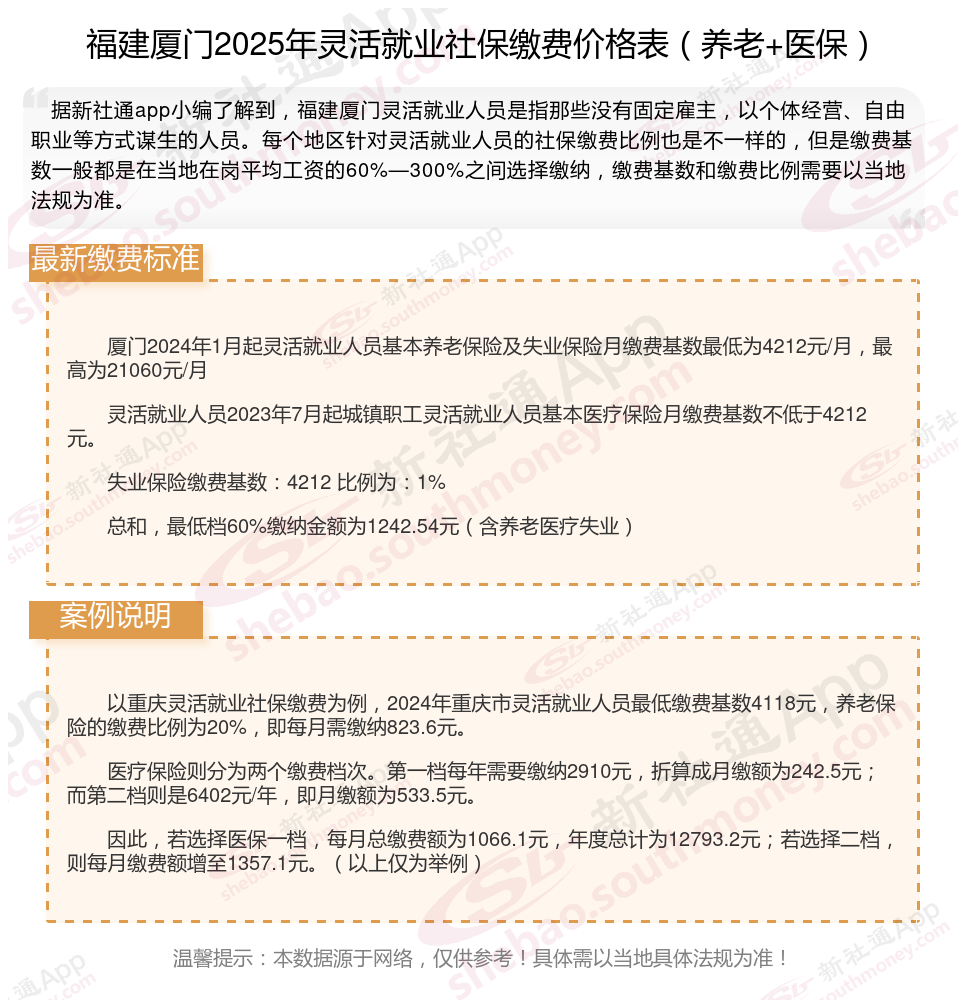 二、2025年福建厦门灵活就业社保缴费标准表 福建厦门灵活就业社保多少钱一个月?