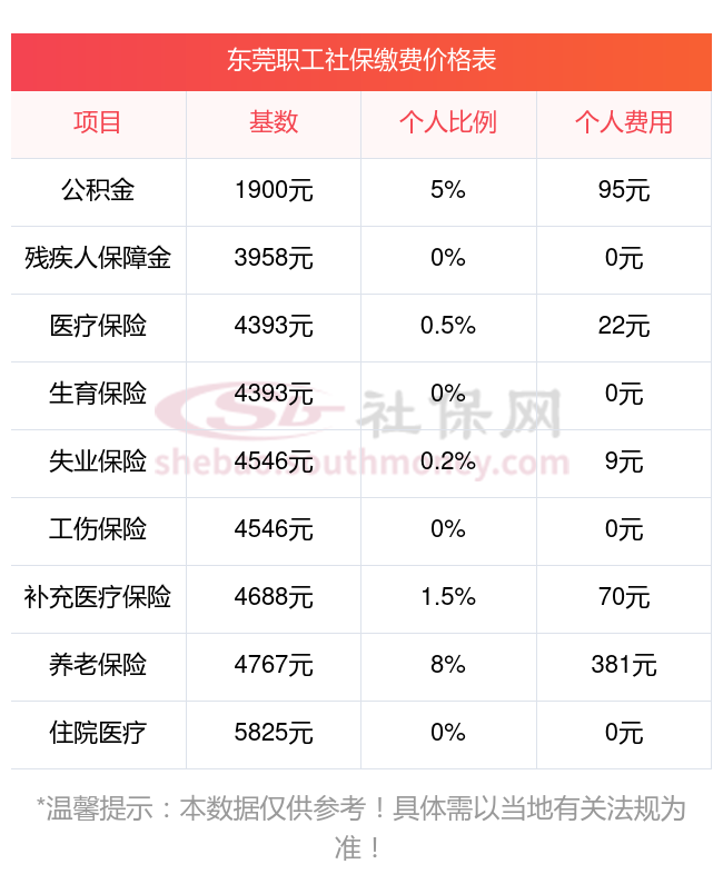 单位每个月扣的五险一金是多少东莞五险一金交多少钱一个月?和新社君一起来看看2024-2025年东莞最低社保费用明细参考,新社通app-社保缴费查询工具提供的最新数据如下: