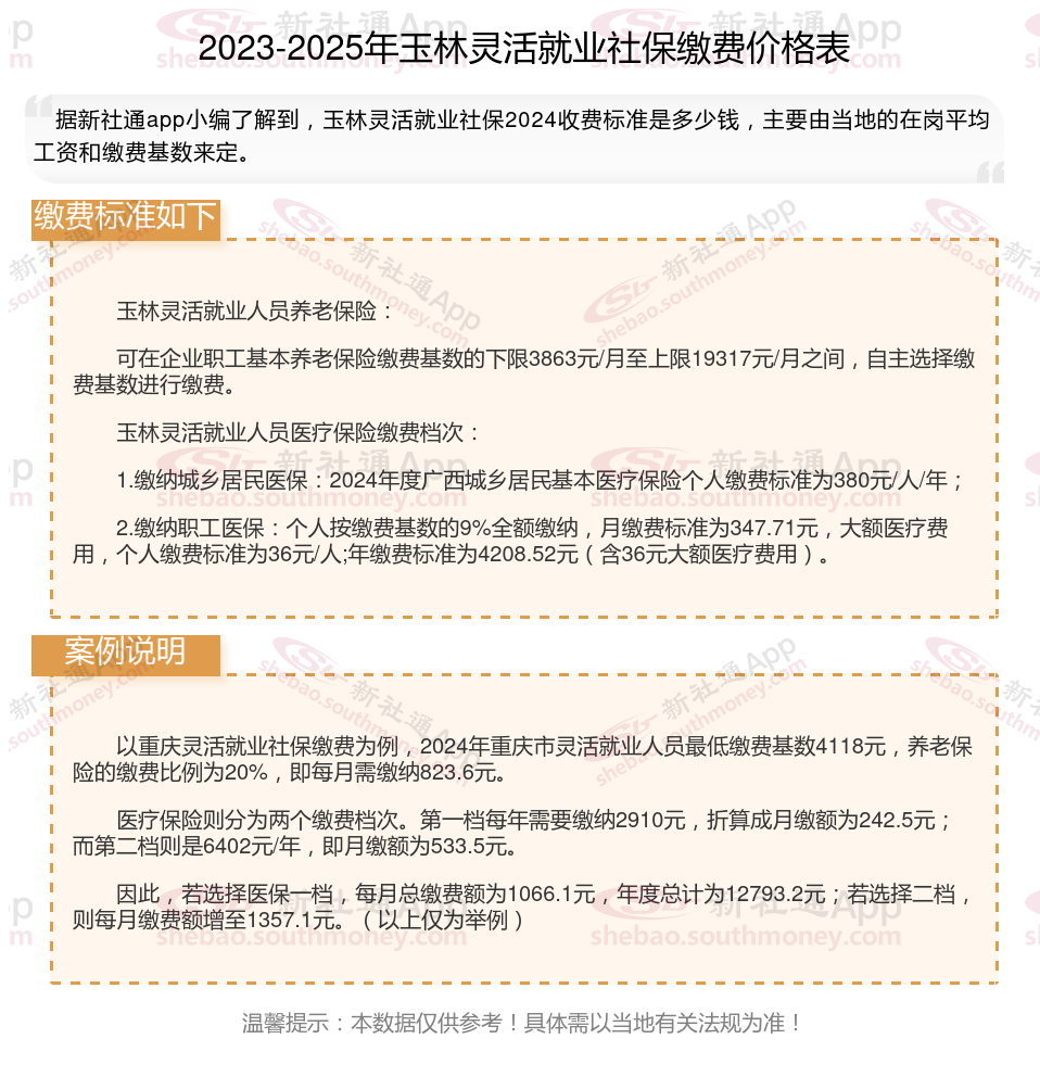 以上就是带来玉林灵活就业社保缴费标准相关知识,内容及数据仅供参考,希望对你有帮助,欢迎关注/下载新社通app解锁更多社保专业资讯。