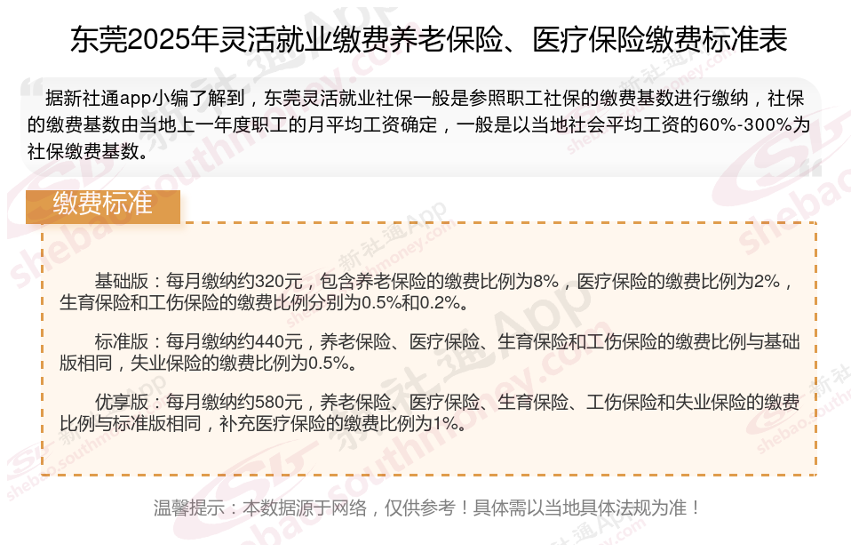 据新社通app数据显示,东莞灵活就业养老保险缴费基数2024-2025年最新标准如下: