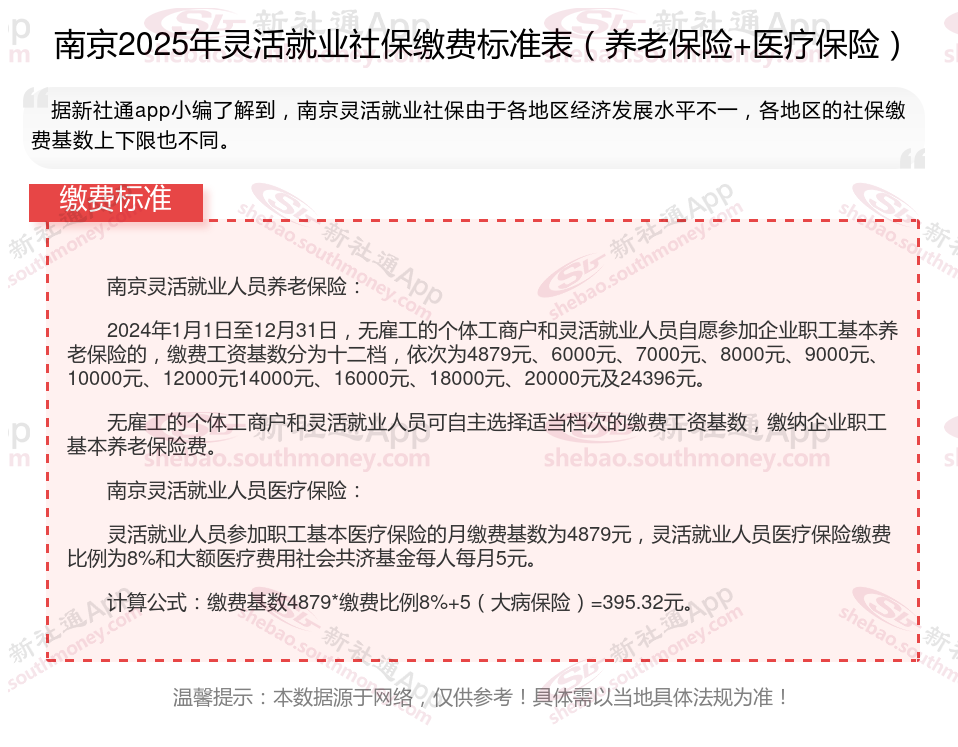 南京灵活就业人员社保缴费标准来了 南京灵活就业人员缴费多少钱怎么查?根据新社通app-社保缴费查询工具提供的2025社保缴费标准详情数据如下: