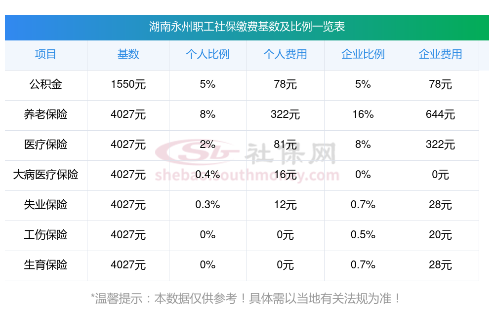 多个条件共同确定社保的缴费金额,其中包含缴费基数、缴费比例,以及当地制定的相关法规。接下来看看,2025年湖南永州社保缴费标准及比例是多少??如下: