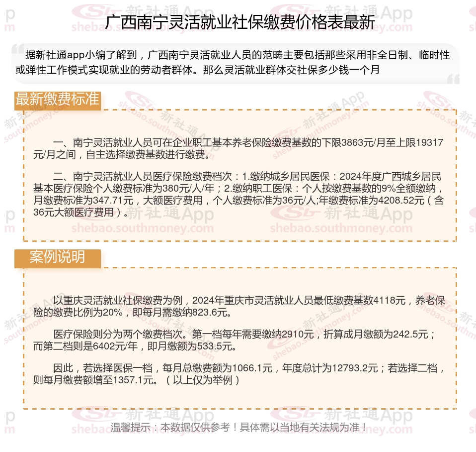 据新社通app数据显示,广西南宁灵活就业养老保险最低缴费基数为:4053.6元;个人的缴费比例分别为:20%;
