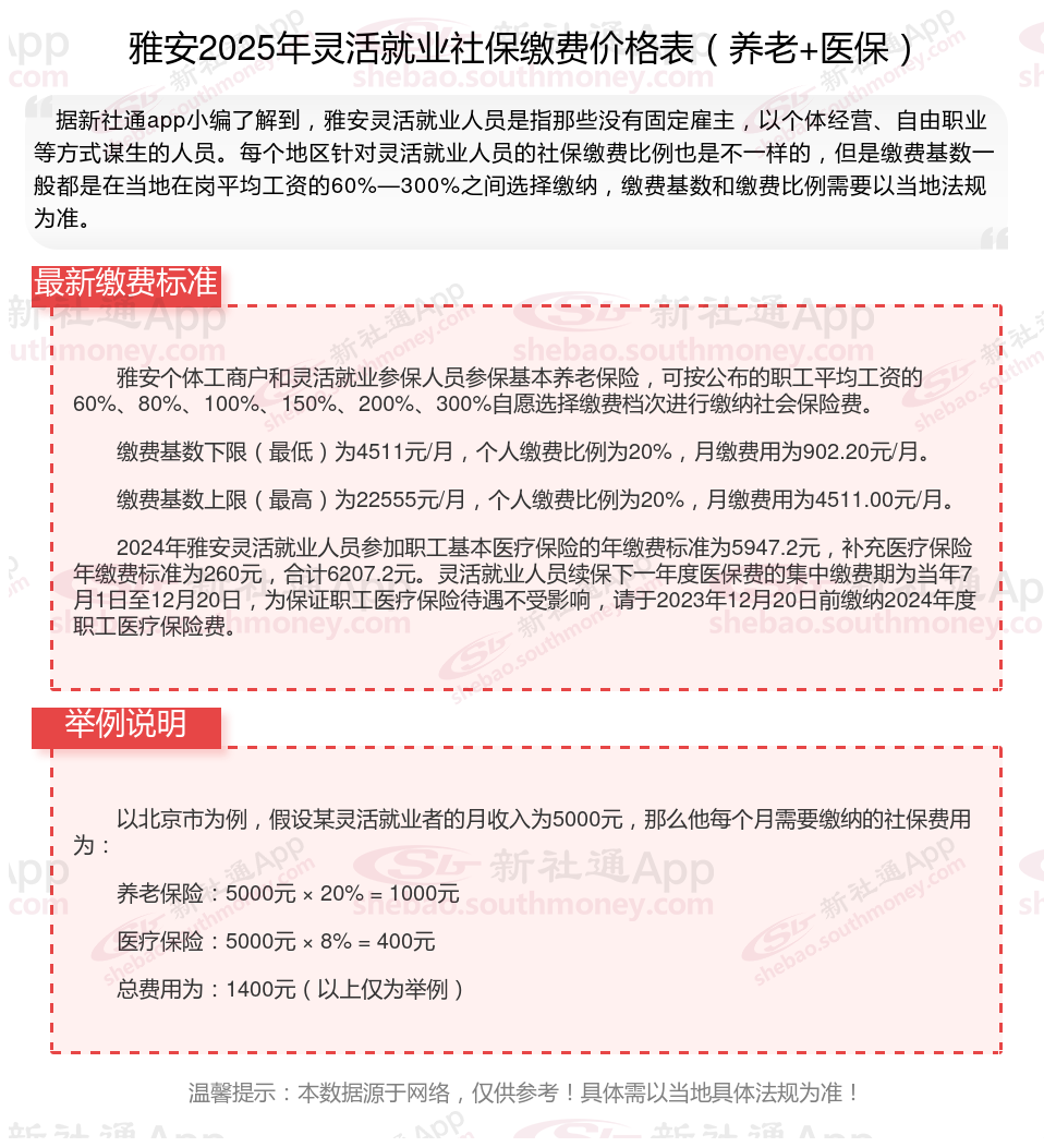 那么,雅安灵活就业人员社保缴费基数最新标准,灵活就业人员自己交社保一个月得交多少钱?根据新社通app-社保缴费查询工具提供的2025社保缴费标准详情数据: