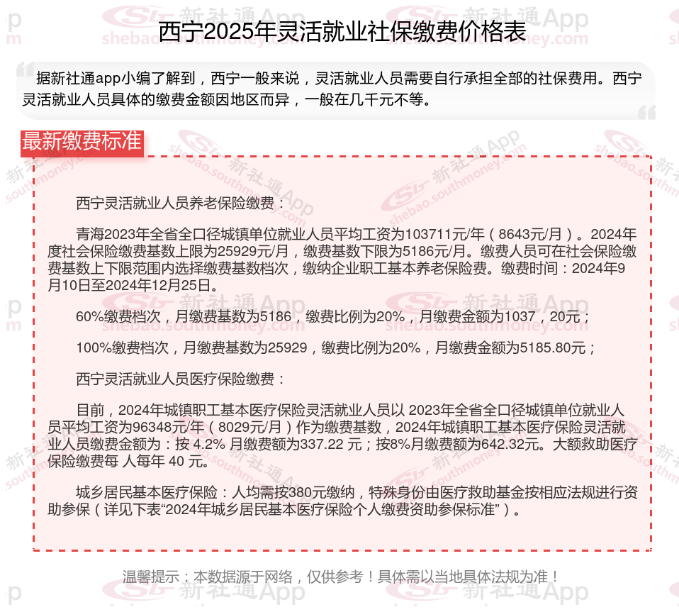 西宁灵活就业人员基本养老保险缴费基数暂按不低于5186元;
