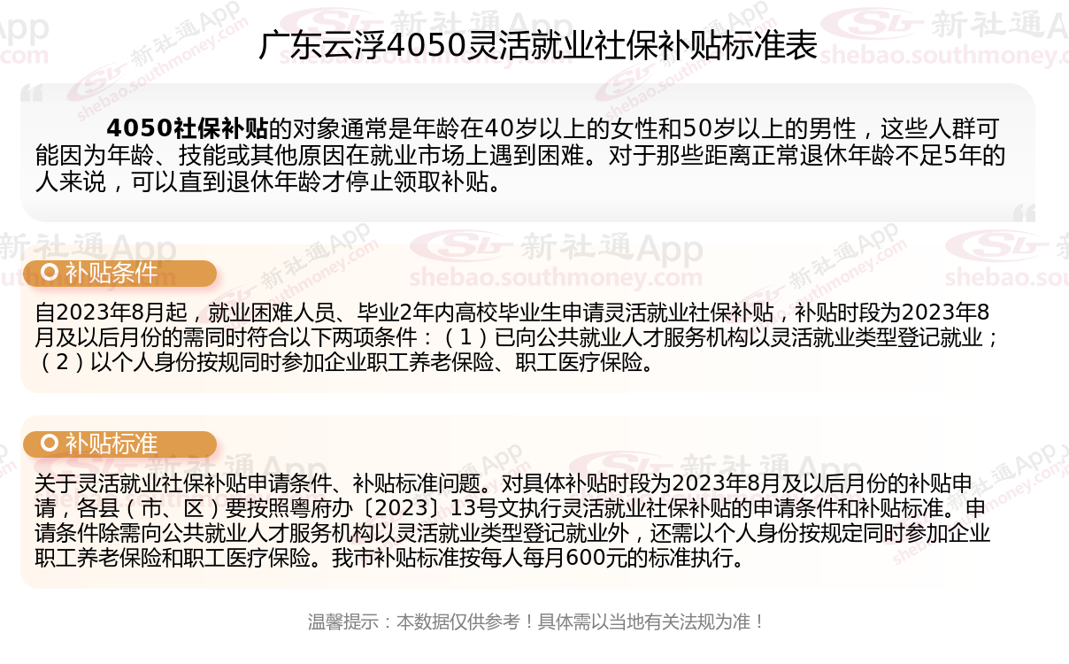 4050补贴需要以灵活就业身份参加职工养老和医疗保险,补贴标准不超过实际缴费的三分之二,最长3年,距离退休不足5年的可延长到退休。补贴对象包括国企下岗人员、低保家庭等。申请流程需要提交身份证、银行账户等。那么广东云浮4050灵活就业社保补贴标准是多少钱?广东云浮4050社保补贴条件是什么?接下来随新社通APP小编了解一下最新资讯。