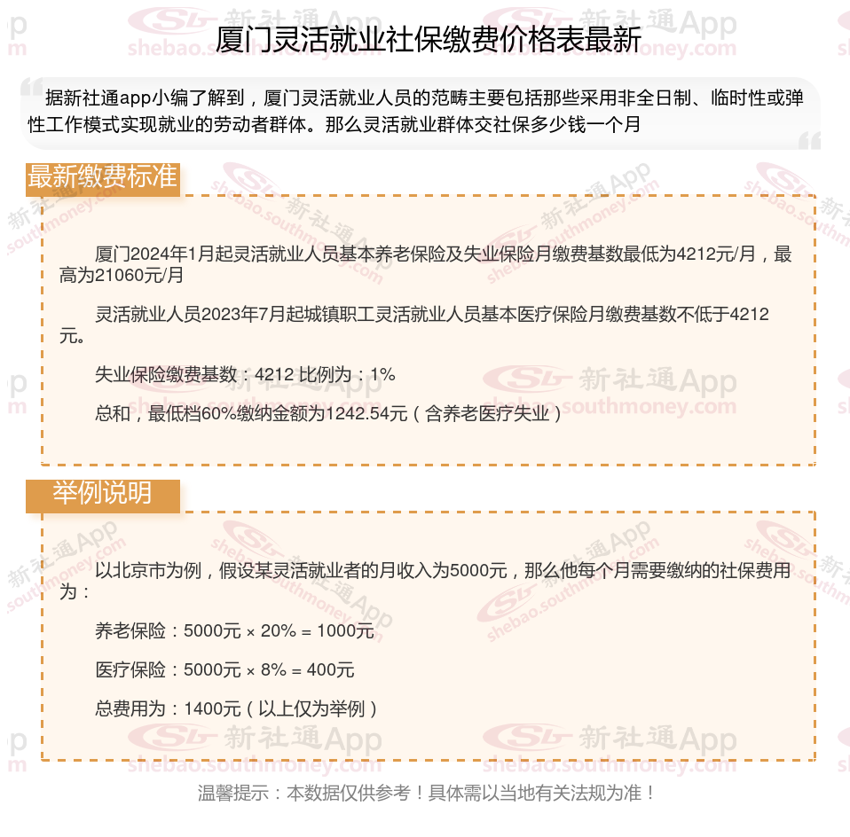 一、2024年厦门灵活就业社保缴费标准表 厦门灵活就业社保多少钱一个月?