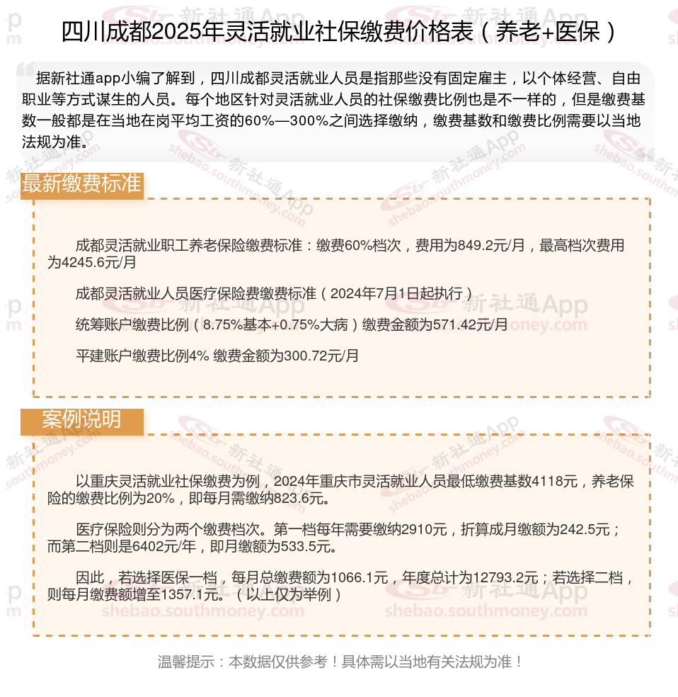 2025年四川成都灵活就业人员社保需要交多少钱?2025灵活就业社保是指针对灵活就业人员的社会保险制。灵活就业人员包括个体经营者、自由职业者、临时工等,他们没有固定的雇主,因此需要自行缴纳社会保险。接下来随新社通APP小编一起来看看。