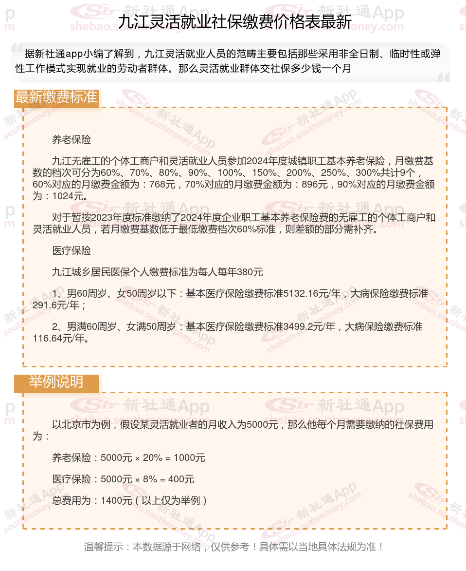 九江灵活就业社保缴费标准来了 灵活就业人员保险一个月交多少钱?根据新社通app-社保缴费查询工具提供的最新数据如下: