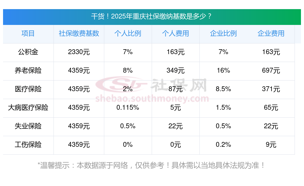 据新社通app-查阅了解到,社保基数通过职工上一年度1月至12月的所有工资性收入所得月平均额来确定,该基数用于计算缴纳社会保险费的工资基数。 目前该重庆社保的缴费基数为:4359.00,个人费用约为:348.72元,企业费用约为:697.44元。