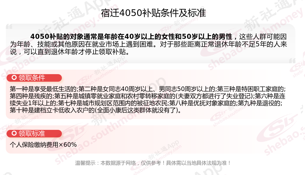 2026宿迁4050补贴主要针对的是年龄在40岁以上的女性和50岁以上的男性,这些人群通常因为年龄较大而面临就业困难。