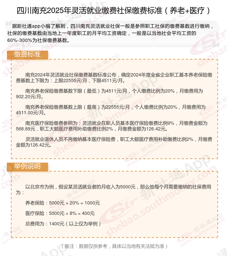 灵活就业社保缴费比例是多少?养老保险一般为缴费基数的20%左右,其中8%计入个人账户,12%计入统筹账户。医疗保险一般为缴费基数的10%左右,具体比例因地区而异。失业保险、工伤保险、生育保险缴费比例较低,具体比例因地区而异。接下来随社保君了解一下2025年四川南充灵活就业人员社保交多少钱,2025年四川南充灵活就业社保缴费标准的详细内容。