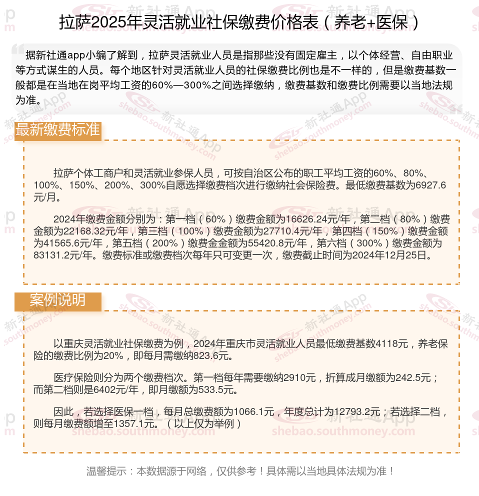 二、2024年拉萨灵活就业社保缴费标准,最新如下: