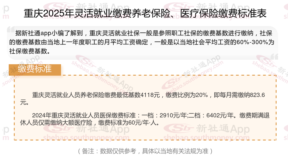 以上就是重庆灵活就业社保缴费的全部内容,数据及内容供参考!希望对你有帮助,欢迎关注新社通app解锁更多社保专业资讯。