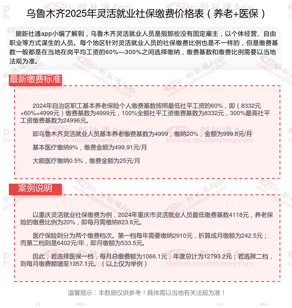 (1)乌鲁木齐灵活就业社保参照职工社保的缴费基数进行缴纳。灵活就业社保由于各地区经济发展水平不一,职工月平均工资存在差异,所以各地区的社保缴费基数上下限也不同。