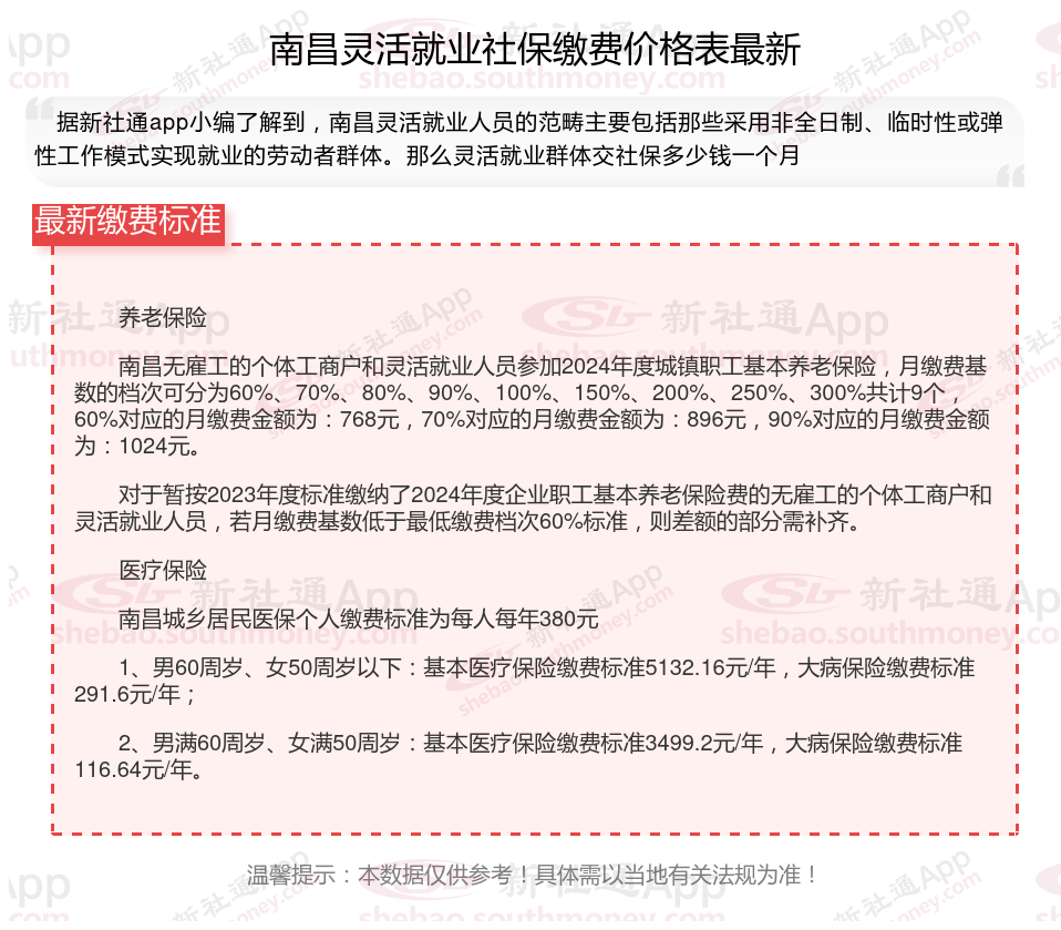 一、2024年南昌灵活就业社保缴费标准表 南昌灵活就业社保多少钱一个月?