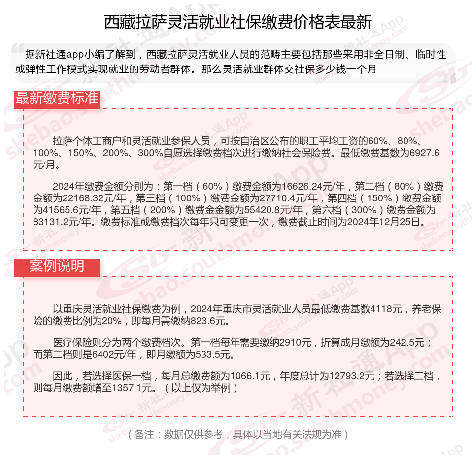 二、2024年西藏拉萨灵活就业社保缴费标准,最新如下: