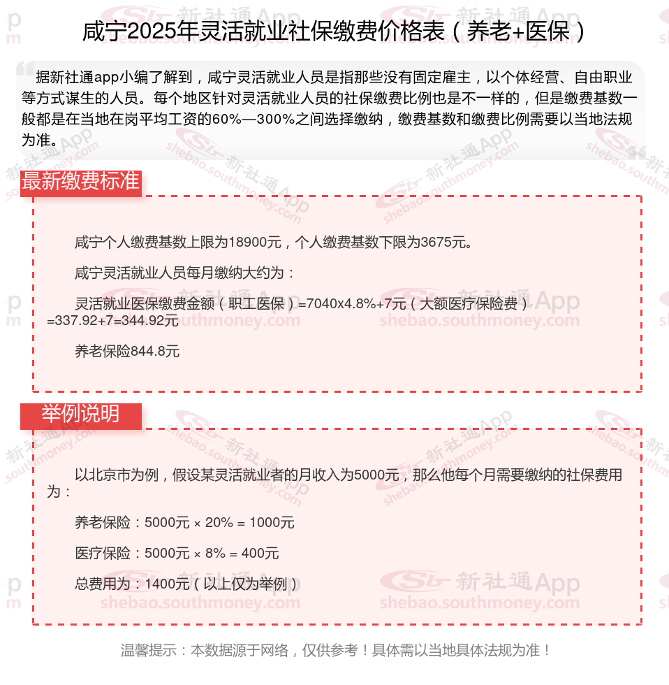 灵活就业社保缴费法规继续完善,涵盖了养老保险、医疗保险、失业保险等多个方面,旨在为灵活就业人员提供全面的社会保证。接下来随社保君了解一下2025年咸宁灵活就业人员社保交多少钱的详细内容。