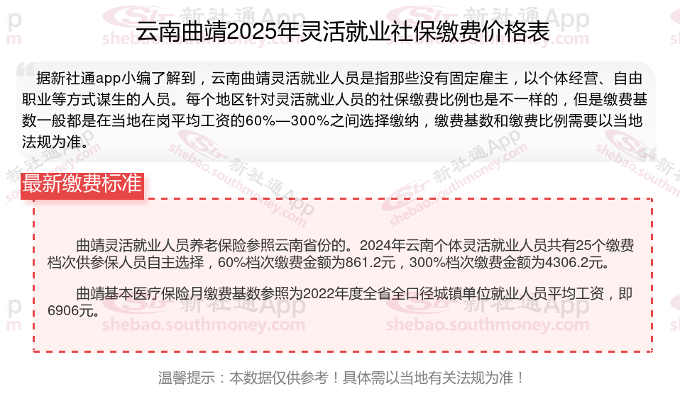 一、2024年云南曲靖灵活就业社保缴费基数、比例最新消息