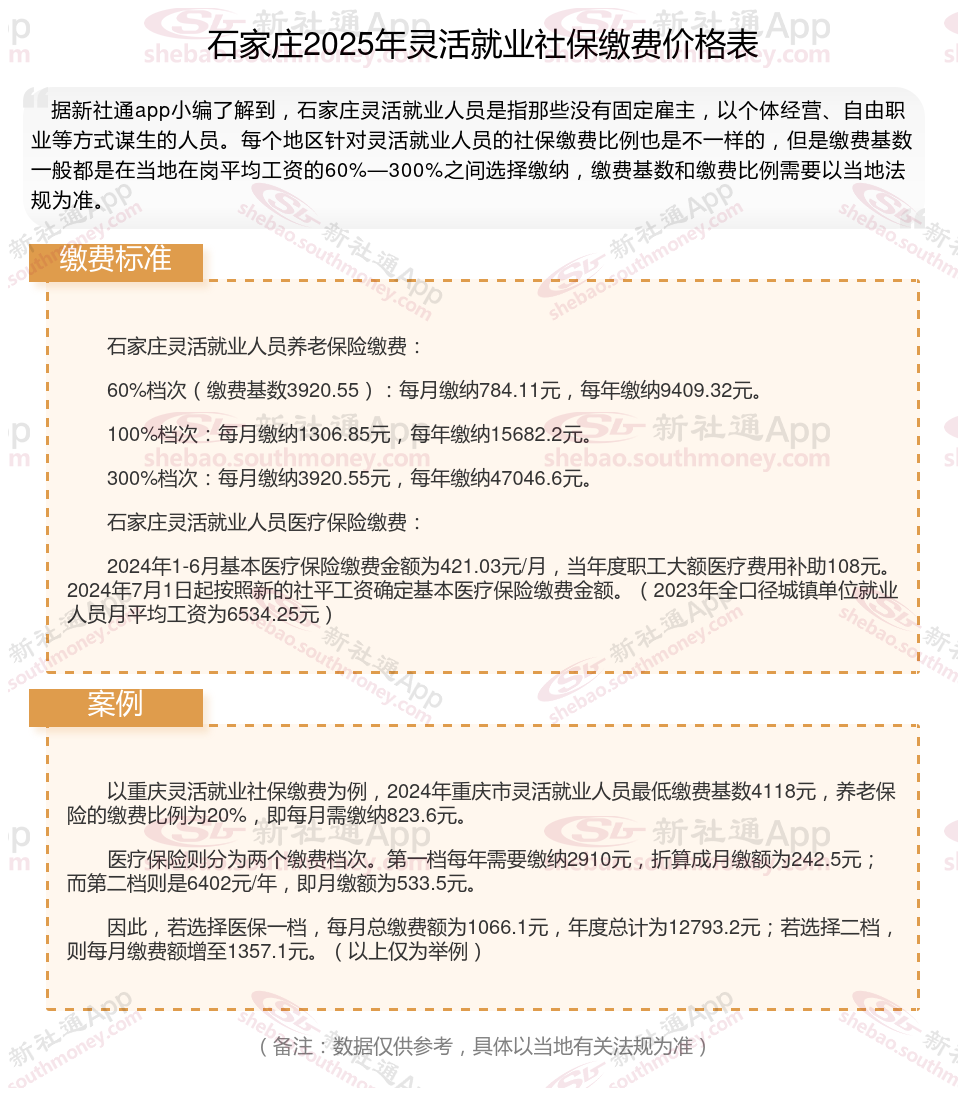 石家庄灵活就业社保2025年收费标准是多少钱,主要由当地的在岗平均工资和缴费基数来定。其次,灵活就业社保缴纳跟职工缴纳不同的地方在于,灵活就业社保参保只能参保养老保险和医疗保险,且缴纳比例完全由个人承担。另外,灵活就业人员社保参保选择,可自由选择参保城镇职工社保和城乡居民保险。2025年石家庄灵活就业社保缴多少钱?如何缴纳?怎么计算待遇?新社通APP小编将在下文为您详细说明。