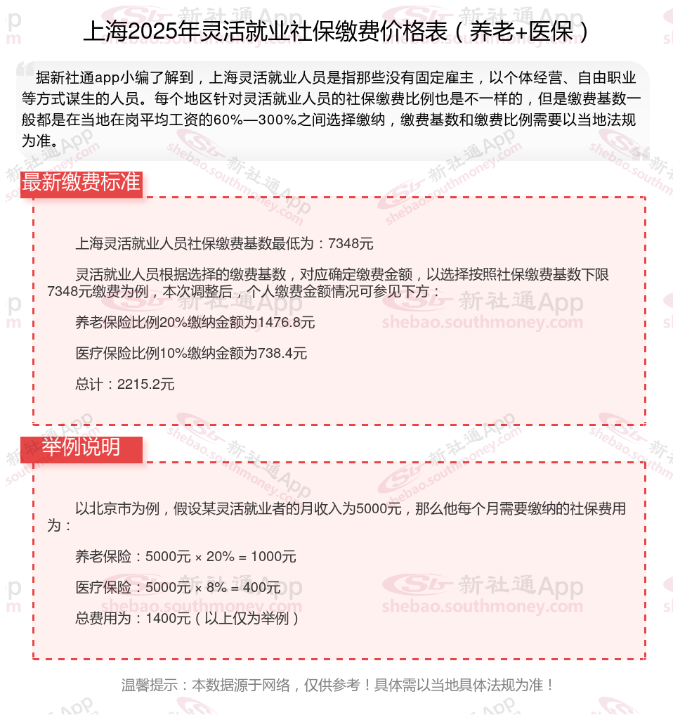灵活就业社保是指针对灵活就业人员的社会保险制。灵活就业人员包括个体经营者、自由职业者、临时工等,他们没有固定的雇主,因此需要自行缴纳社会保险。那么2025年上海灵活就业人员社保需要交多少钱?下面随新社通小编一起来看看。
