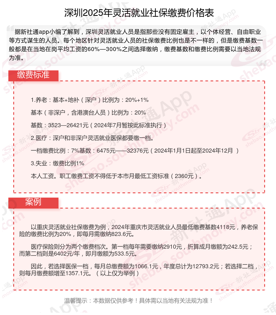 2025年深圳灵活就业人员社保需要交多少钱?灵活就业,作为一种非传统的就业方式,近年来蓬勃发展。为保护这部分人群的权益,国制定了相应的社保缴费法规。2024年,灵活就业社保缴费法规继续完善,涵盖了养老保险、医疗保险、失业保险等多个方面,旨在为灵活就业人员提供全面的社会保证。接下来随新社通APP小编一起来看看。