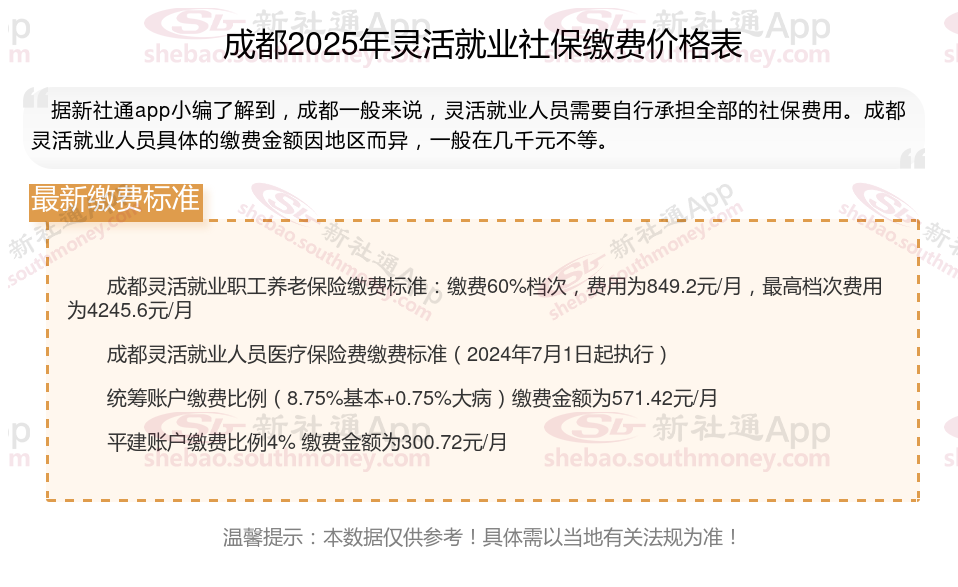 2025年成都灵活就业人员社保需要交多少钱?随着经济社会的不断发展,灵活就业群体也日益壮大,其社保缴费问题也愈发受到关注。接下来随新社通APP小编一起来看看灵活就业群体社保缴费问题吧。