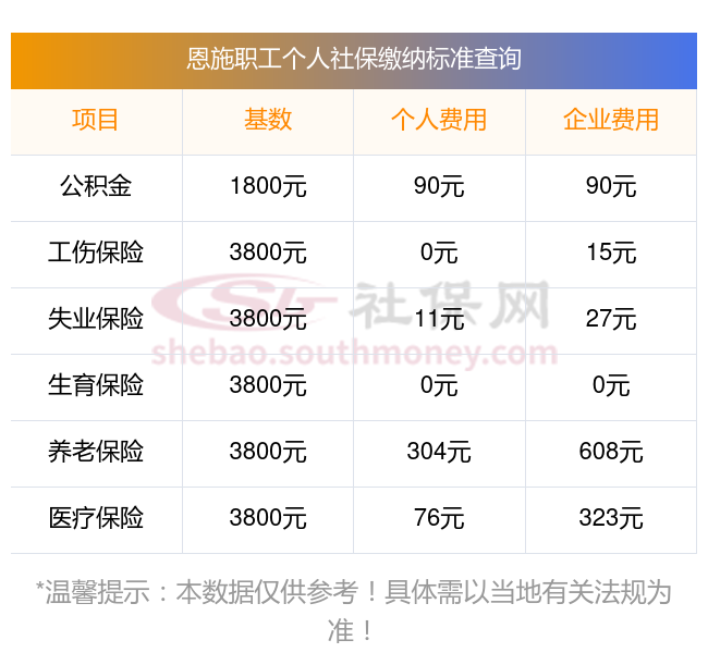 恩施社保缴费多少钱一个月?2024-2025年社保缴费最新标准参照如下: 职工社保缴费基数为:3800.00元