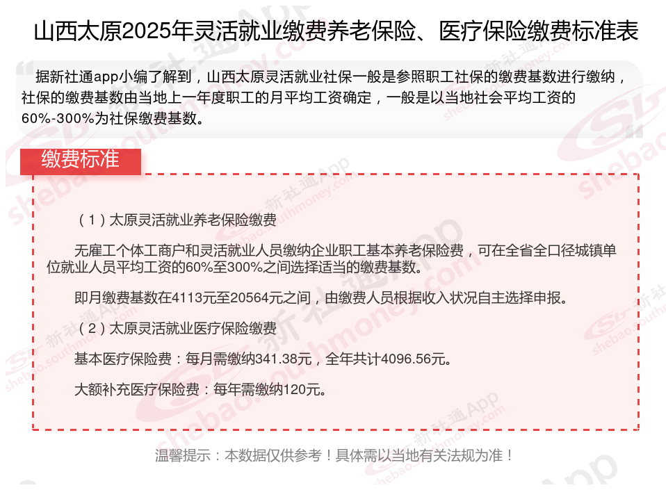 灵活就业社保缴费比例是多少?养老保险一般为缴费基数的20%左右,其中8%计入个人账户,12%计入统筹账户。医疗保险一般为缴费基数的10%左右,具体比例因地区而异。失业保险、工伤保险、生育保险缴费比例较低,具体比例因地区而异。接下来随社保君了解一下2025年山西太原灵活就业人员社保交多少钱,2025年山西太原灵活就业社保缴费标准的详细内容。