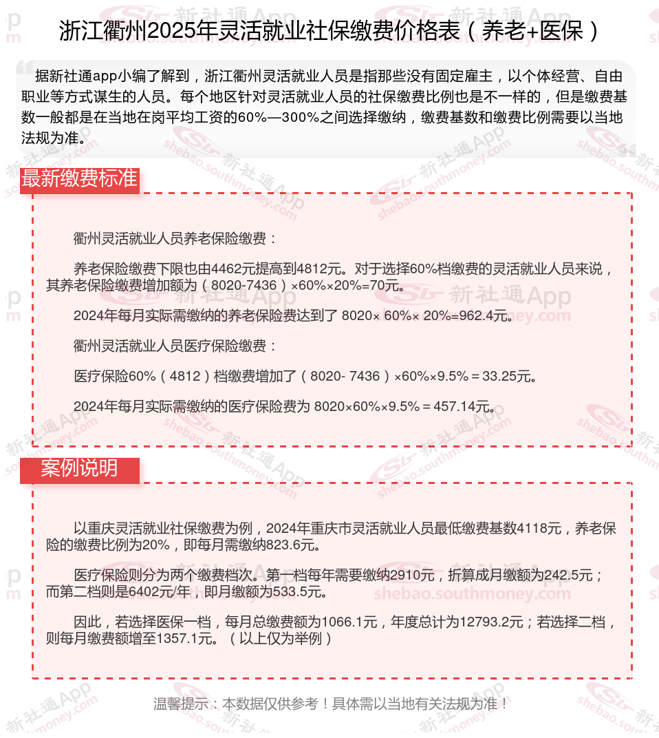 浙江衢州灵活就业社保2025年收费标准是多少钱,主要由当地的在岗平均工资和缴费基数来定。其次,灵活就业社保缴纳跟职工缴纳不同的地方在于,灵活就业社保参保只能参保养老保险和医疗保险,且缴纳比例完全由个人承担。另外,灵活就业人员社保参保选择,可自由选择参保城镇职工社保和城乡居民保险。2025年浙江衢州灵活就业社保缴多少钱?如何缴纳?怎么计算待遇?新社通APP小编将在下文为您详细说明。